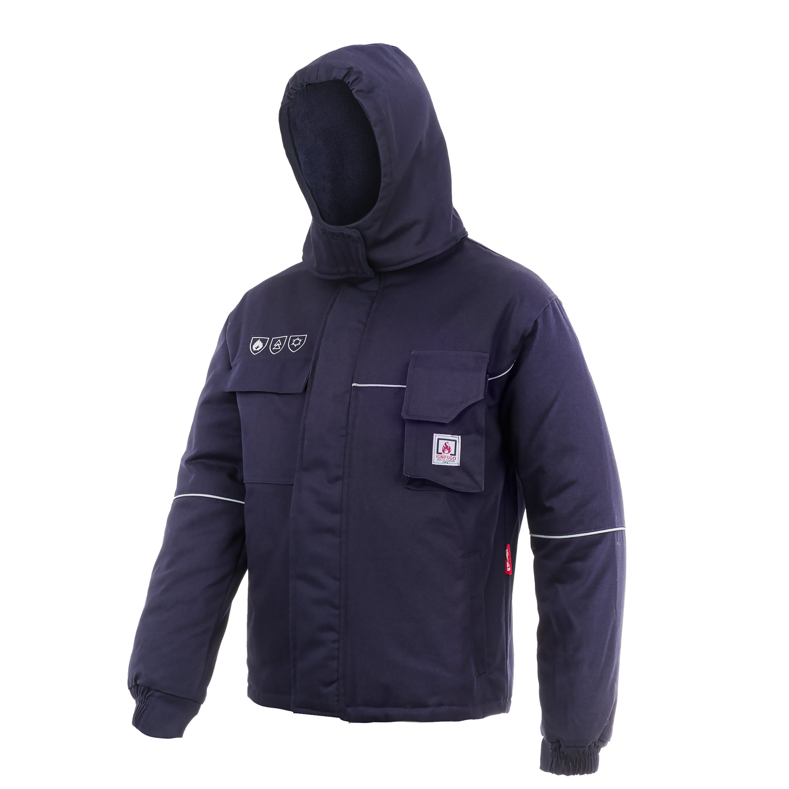 Parka Térmica Ignifuga Hombre, prenda fabricada por 3 capas, tejidos exterior de calada, napa y forro interior ignifuga, que posee sistema de aislación térmica con propiedades retardante a llama.